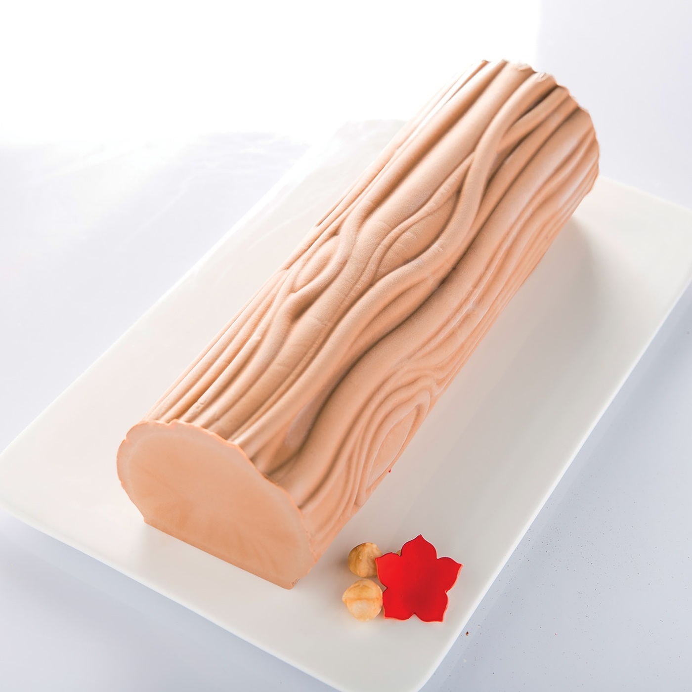 The Wood mat, sized 11" x 7", H 0.2" is presented in black and it adapts perfectly to the log shaped mold Bûche (9.84" x 3.54", H 2.75") allowing you, after putting the mat inside of it, to make a perfect log for cooked or semifreddo preparations with wood texture.